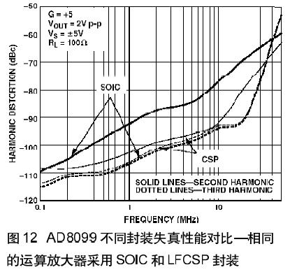 這種引腳排列還有一個好處就是降低了二次諧波失真。傳統(tǒng)運算放大器的引腳配置中引起二次諧波失真的一個原因是同相輸入和負(fù)電源引腳之間的耦合作用。LFCSP封裝的低失真引腳排列消除了這種耦合所以極大地降低了二次諧波失真;在有些情況下多可降低14 dB。圖12示出了AD80992 采用SOIC封裝和LFCSP封裝失真性能的差別。