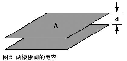 當(dāng)尋找有問題的寄生源時,可能用得著幾個計算上述那些寄生電容尺寸的基本公式。公式(1)是計算平行極板電容器(見圖5)的公式。