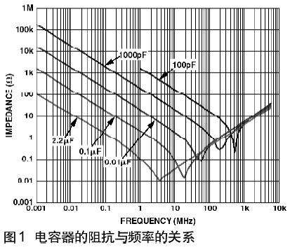 并聯(lián)不同的電容值的電容器有助于確保電源引腳在很寬的頻帶上只能看到很低的交流(AC)阻抗。這對于在運算放大器電源抑制比(PSR)衰減頻率處尤其重要。該電容器有助于補償放大器降低的PSR。在許多十倍頻程范圍內(nèi)保持低阻抗的接地通路將有助于確保有害的噪聲不能進(jìn)入運算放大器。圖1示出了采用多個并聯(lián)電容器的優(yōu)點。在低頻段,大的電容器提供低阻抗的接地通路。但是一旦頻率達(dá)到了它們自身的諧振頻率,電容器的容性就會減弱,并且逐漸呈現(xiàn)出感性。這就是為什么采用多個電容器是很重要的原因:當(dāng)一個電容器的頻率響應(yīng)開始下降時,另一個電容器的頻率響應(yīng)開始起作用,所以能在許多十倍頻程范圍內(nèi)保持很低的AC阻抗。