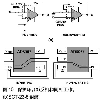 保護(hù)環(huán),或者說“隔離環(huán)”,是運算放大器常用的另一種屏蔽方法,它用于防止寄生電流進(jìn)入敏感結(jié)點。其基本原理很簡單――用一條保護(hù)導(dǎo)線將敏感結(jié)點完全包圍起來,導(dǎo)線保持或者迫使它保持(低阻抗)與敏感結(jié)點相同的電勢,因此使吸收的寄生電流遠(yuǎn)離了敏感結(jié)點。圖15(a)示出了用于運算放大器反相配置和同相配置中的保護(hù)環(huán)的原理圖。圖15(b)示出用于SOT-23-5封裝中兩種保護(hù)環(huán)的典型布線方法。