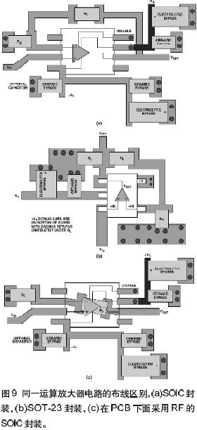 圖9示出了采用SOIC封裝(a)和SOT-23封裝(b)的運算放大器之間的布線區(qū)別。每種封裝都有它自身的一些問題。重點看(a),仔細(xì)觀察反饋路徑就發(fā)現(xiàn)有多種方法連接反饋。重要的是保證印制線長度短。反饋路徑中的寄生電感會引起振鈴和過沖。在圖9(a)和9(b)中,環(huán)繞放大器連接反饋路徑。圖9(c)示出了另外一種方法――在SOIC封裝下面連接反饋路徑――這樣就減小了反饋路徑的長度。每種方法都有細(xì)微的差別。一種方法會導(dǎo)致印制線過長,會增大串聯(lián)電感。二種方法采用了通孔,會引起寄生電容和寄生電感。在給PCB布線時必須要考慮這些寄生效應(yīng)的影響及其隱含的問題。SOT-23布線差幾乎是理想的:反饋印制線長度短,而且很少利用通孔;負(fù)載和旁路電容從很短的路徑返回到相同的地線連接;正電源端的電容(圖9(b)中未示出)直接放在PCB背面的負(fù)電源電容的下面。