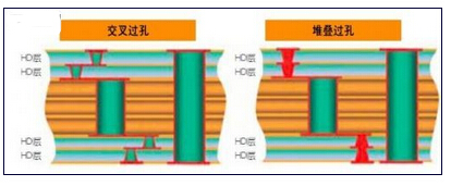 推薦使用深度多6層的盲孔/埋孔配置。層數(shù)再多會引起制造良率問題。優(yōu)選技術是使用交叉過孔或堆疊過孔,如圖8所示。交叉過孔允許更加精確的注冊公差,因為它們不像堆疊過孔那樣強制要求完美對齊。