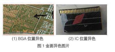 (1) 將沉金金缸金濃度提高至1.2g/L仍有異色現(xiàn)象,說明金濃度不是導(dǎo)致IC或BGA異色的原因;