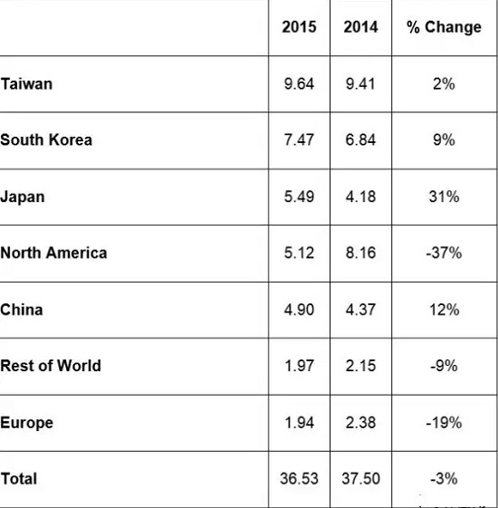 際半導體設備與材料協(xié)會-SEMI3月14日公布:2015年全球半導體制造設備總銷售為365.3億美元,較上一年減少了3%。2015年總設備訂單比2014年低5%。