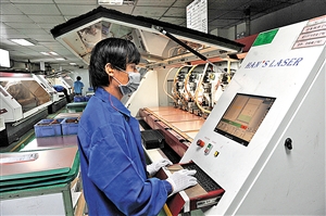 五株科技的員工在流水線(xiàn)上制作電路板。