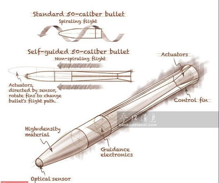 狙擊手在使用制導(dǎo)子彈時(shí),只要鎖定目標(biāo),不論朝哪個(gè)方向射擊,子彈后都能通過自主修正彈道命中目標(biāo)。這張手繪圖展示了制導(dǎo)子彈和傳統(tǒng)子彈之間的顯著區(qū)別,傳統(tǒng)子彈需要靠自旋穩(wěn)定彈道(上),制導(dǎo)子彈(下)無需自旋,直接靠尾部的彈翼就可改變飛行彈道。有人吐槽稱,配備這種子彈后,人人都能成為神槍手,或許狙擊手的時(shí)代就此結(jié)束了。吐槽歸吐槽,制導(dǎo)子彈的實(shí)戰(zhàn)效果仍需拭目以待。