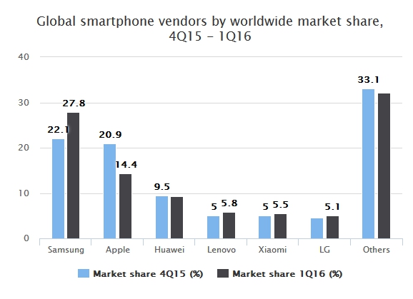 TrendForce公司稱,蘋果在全球手機市場上所占的份額從2015年四季度的20.9%下跌到了2016年一季度的14.4%;而它的競爭對手三星,得益于其Galaxy S7和Galaxy S7 Edge手機的強勁銷售態(tài)勢,其市場份額從22.1%增長到了27.8%。
