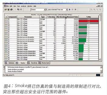 Smoke選項可以對電能耗散,連接點溫度增加,二次崩潰,或電壓/電流限制違例引起受壓的部件做出預(yù)警,經(jīng)過一定時間, 這些部件可能導(dǎo)致電路失敗,設(shè)計師可以用Smoke將電路仿真結(jié)果和部件的安全運行限制進(jìn)行對比,如果超過限制,Smoke 就可以識別問題參數(shù),使用Smoke分析還可用于創(chuàng)建,修改和配置供使用的decrate 文件,見圖4。