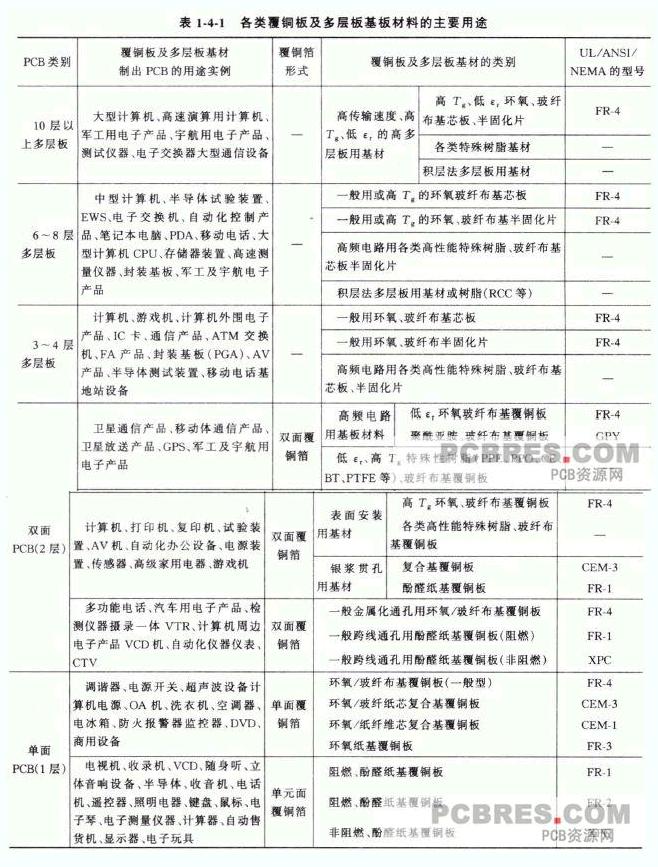 各類覆銅板及多層板基板材料的主要用途見表1-4-1 所示。