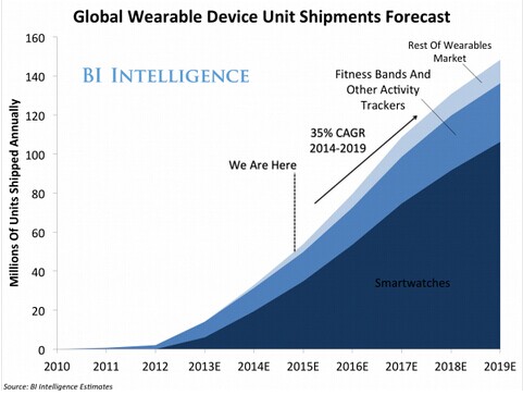 BI報(bào)告指出,穿戴設(shè)備未來(lái)幾年將迎來(lái)高增長(zhǎng)期。預(yù)計(jì)在未來(lái)五年之內(nèi),全球穿戴設(shè)備的復(fù)合增長(zhǎng)率將高達(dá)35%,到2019年的年銷(xiāo)量將達(dá)到近1.5億部。