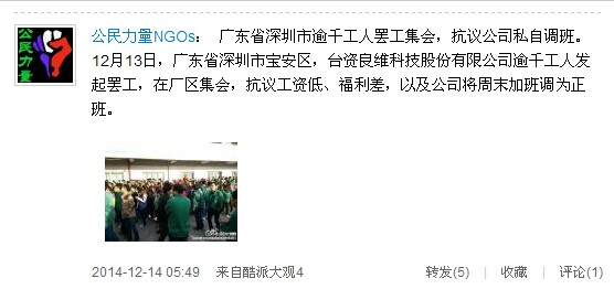 據(jù)網(wǎng)友發(fā)布的微博顯示,當日逾千名工人冒著寒風聚集在廠區(qū)內(nèi),有人握拳舉手,高呼口號,而警方及保安則在場維持秩序,雙方未見沖突。另有一名手持擴音器,疑似廠方負責人站在人群前,與數(shù)名工人討論。