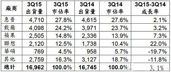 (來(lái)源:Gartner,2015年10月;備注:以上數(shù)據(jù)包含桌上型PC、筆記型PC與頂級(jí)ultramobile機(jī)種。所有資料均根據(jù)初步調(diào)查結(jié)果所推估,后推估值可能有所變動(dòng)。本統(tǒng)計(jì)數(shù)據(jù)以銷售到通路的出貨量為準(zhǔn)。因采自舍五入,個(gè)別數(shù)字加總可能有別于總計(jì)數(shù)量。)