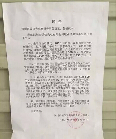 據(jù)領(lǐng)信光電貼出來的歇業(yè)清算通告顯示,拖欠供應(yīng)商款項逾1600萬元,同時公司負責(zé)人還私人借款逾600萬,拖欠員工工資也達250多萬元。
