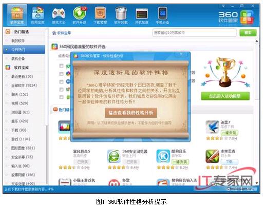這結(jié)果給力準(zhǔn)確嗎?神不神馬,小編馬上一試便知。安裝360安全衛(wèi)士8.5beta版后,一次運行360安全衛(wèi)士,進(jìn)入“軟件管家”,“360心理學(xué)磚家”會立刻彈出一個“軟件性格分析”提示(如圖1)。